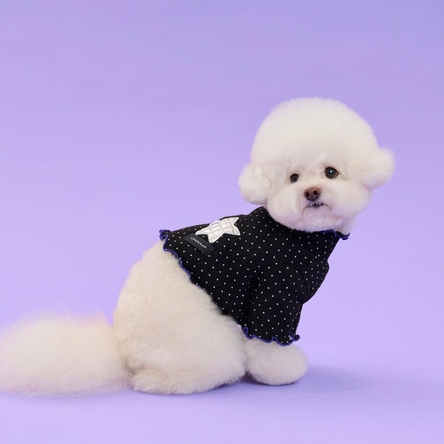 【COMOCOMO】 洗練されたドット柄が目を惹く「Silver Bell」トップス。 首元を包み込むタートルネックデザインで、あたたかさとスタイリッシュさを両立。 スリムなシルエットが愛犬のスタイルを引き立て、上品で可愛らしい印象に仕上がります。 ⸻ POINT ・フラワーモチーフ × ラッフルレイヤードデザイン ・細やかなポルカドット柄で大人可愛い雰囲気 ・タートルネック仕様で首元をやさしく包み込み ⸻ COLOR dot black ⸻ WASHING TIP ・色分けして単独洗いをしてください ・冷水またはぬるま湯で手洗い推奨 ・中性または低刺激性洗剤を使用 ・天日干しまたは自然乾燥