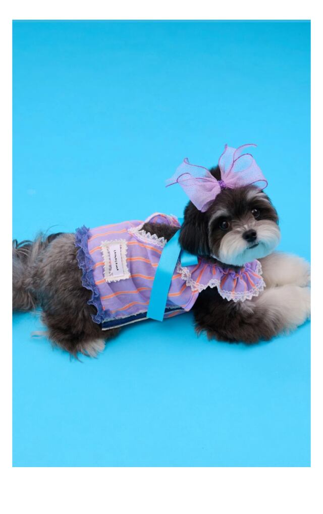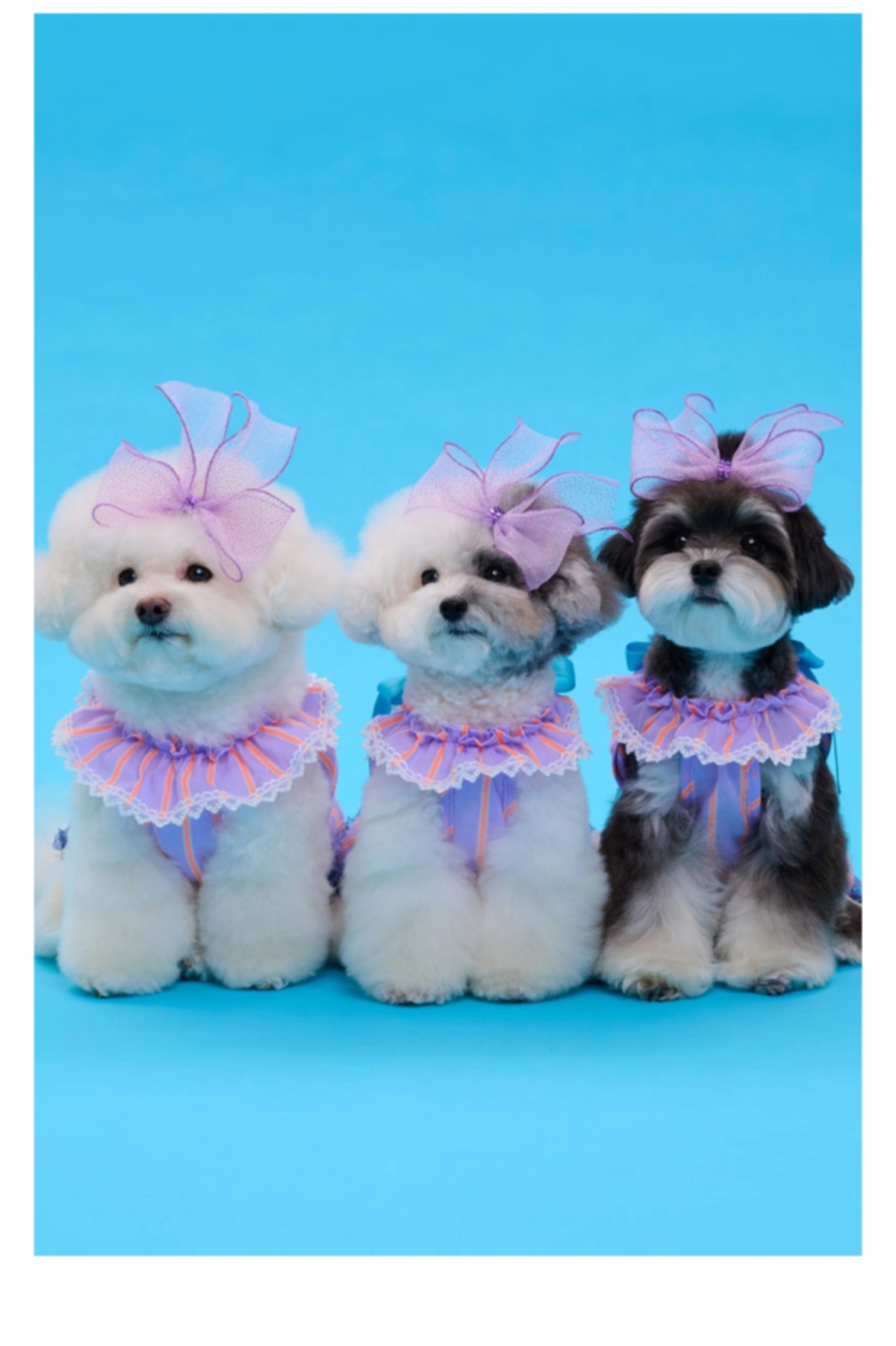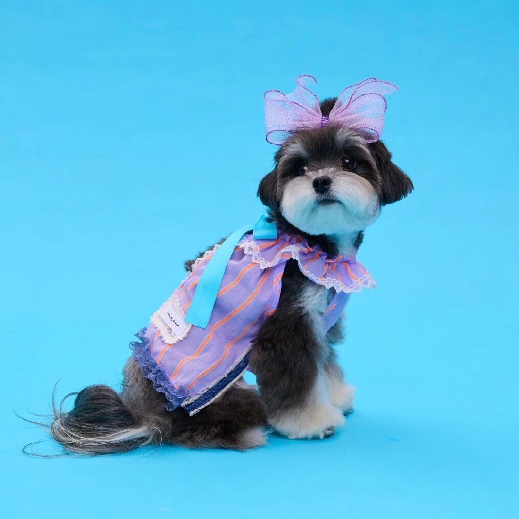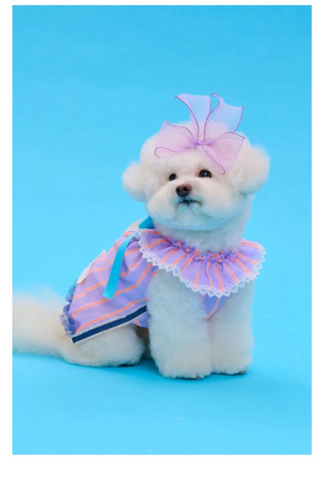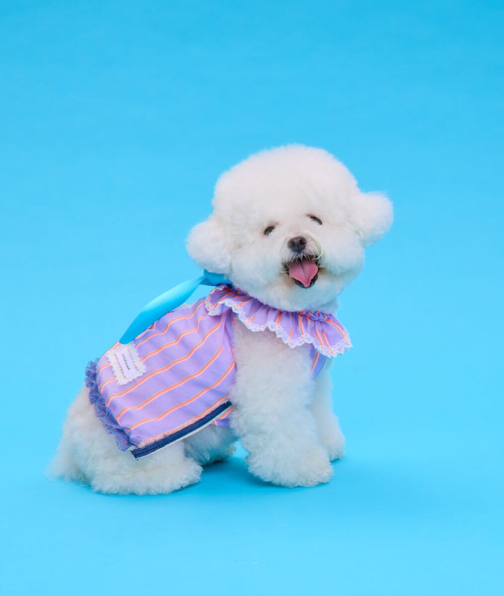 フリルカラーとリボン装飾を贅沢にあしらい、Aラインシルエットで上品かつ可憐な印象に。