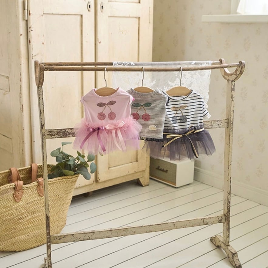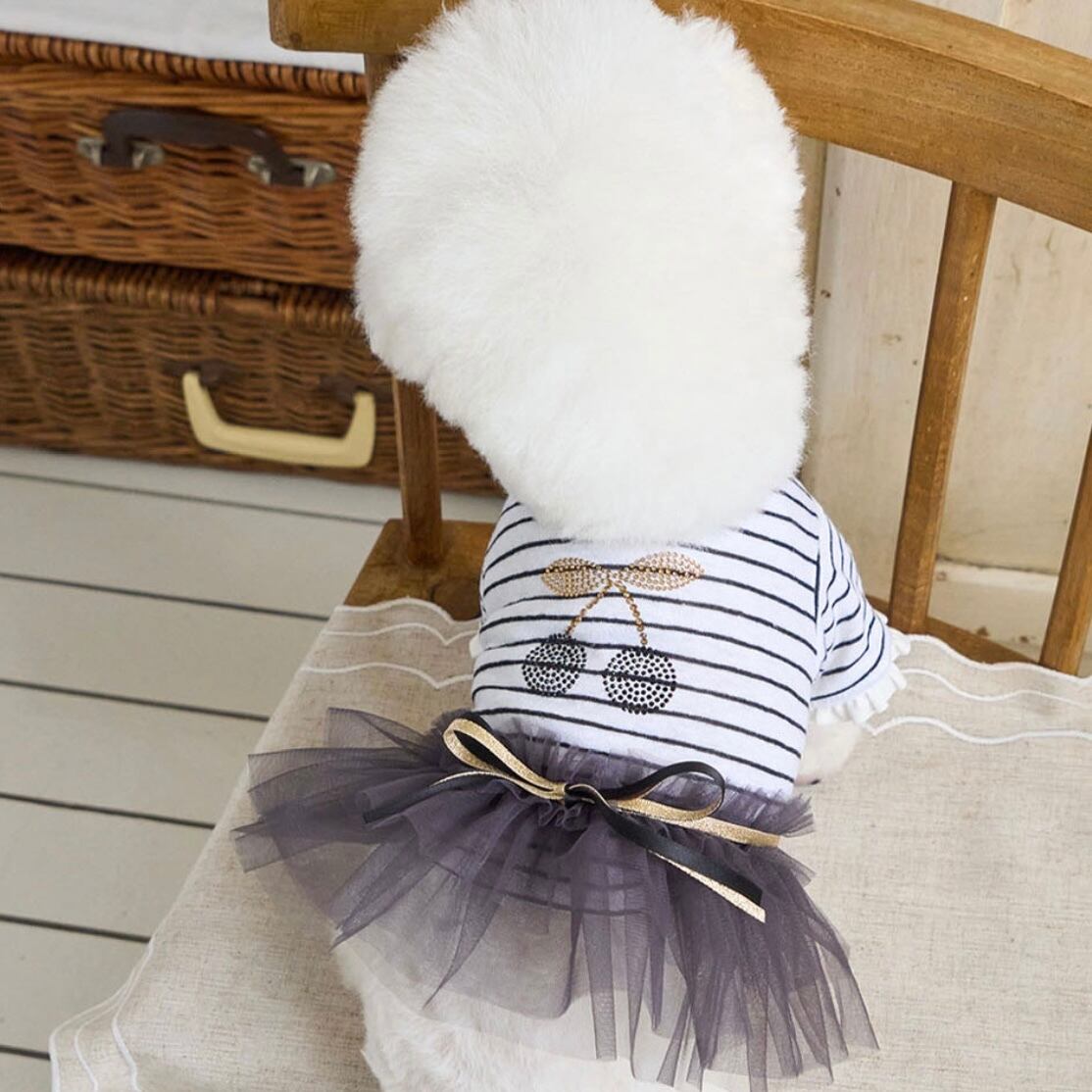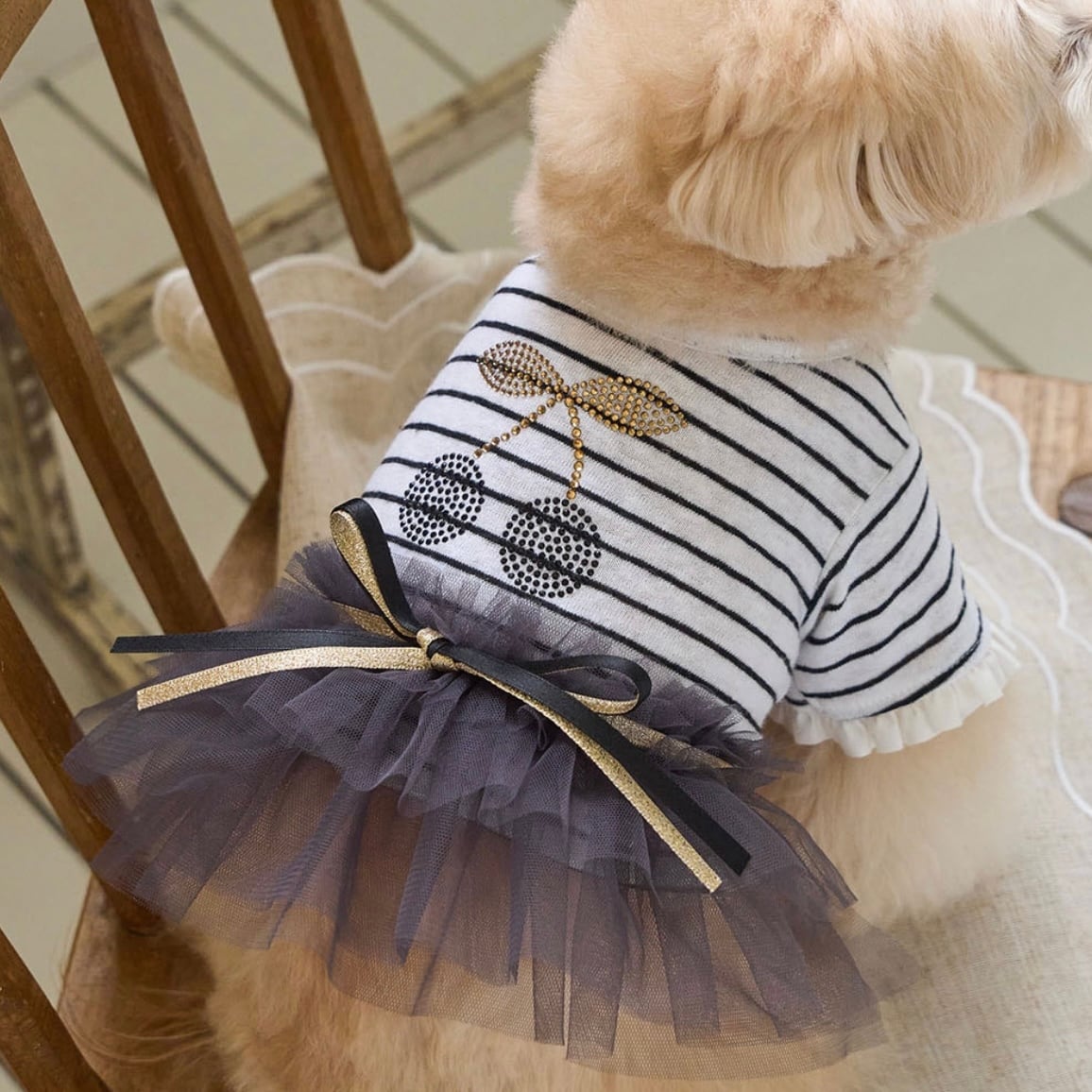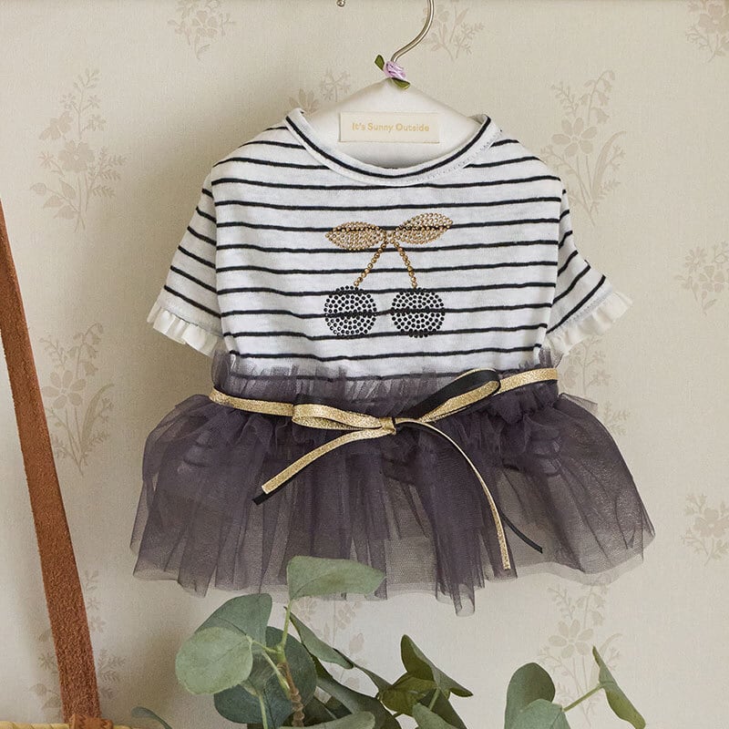 モノトーンストライプに、輝くチェリーモチーフとたっぷりのチュチュを重ねた特別な一着。