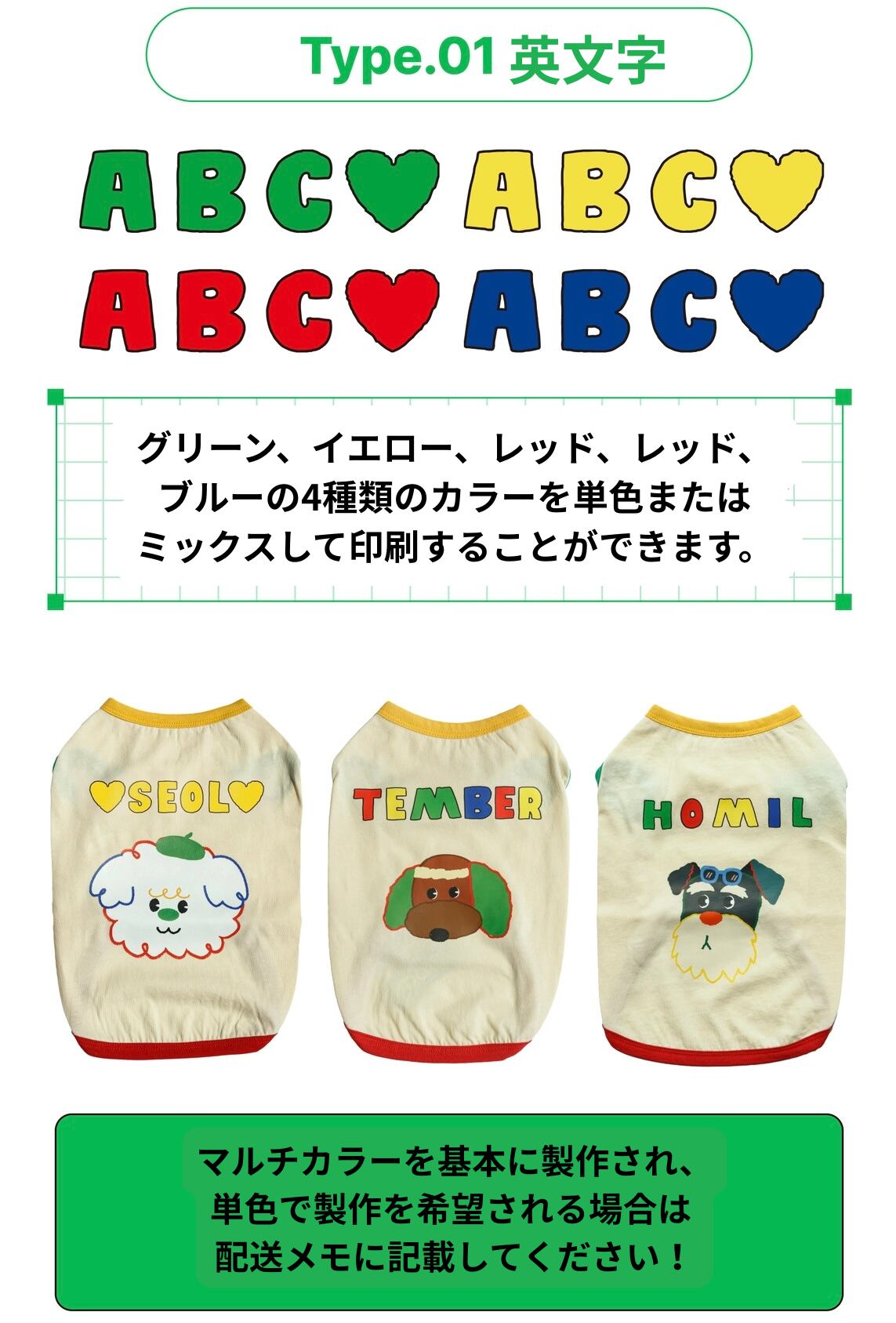 - TYPE 1:単色/ミックスカラー英文字