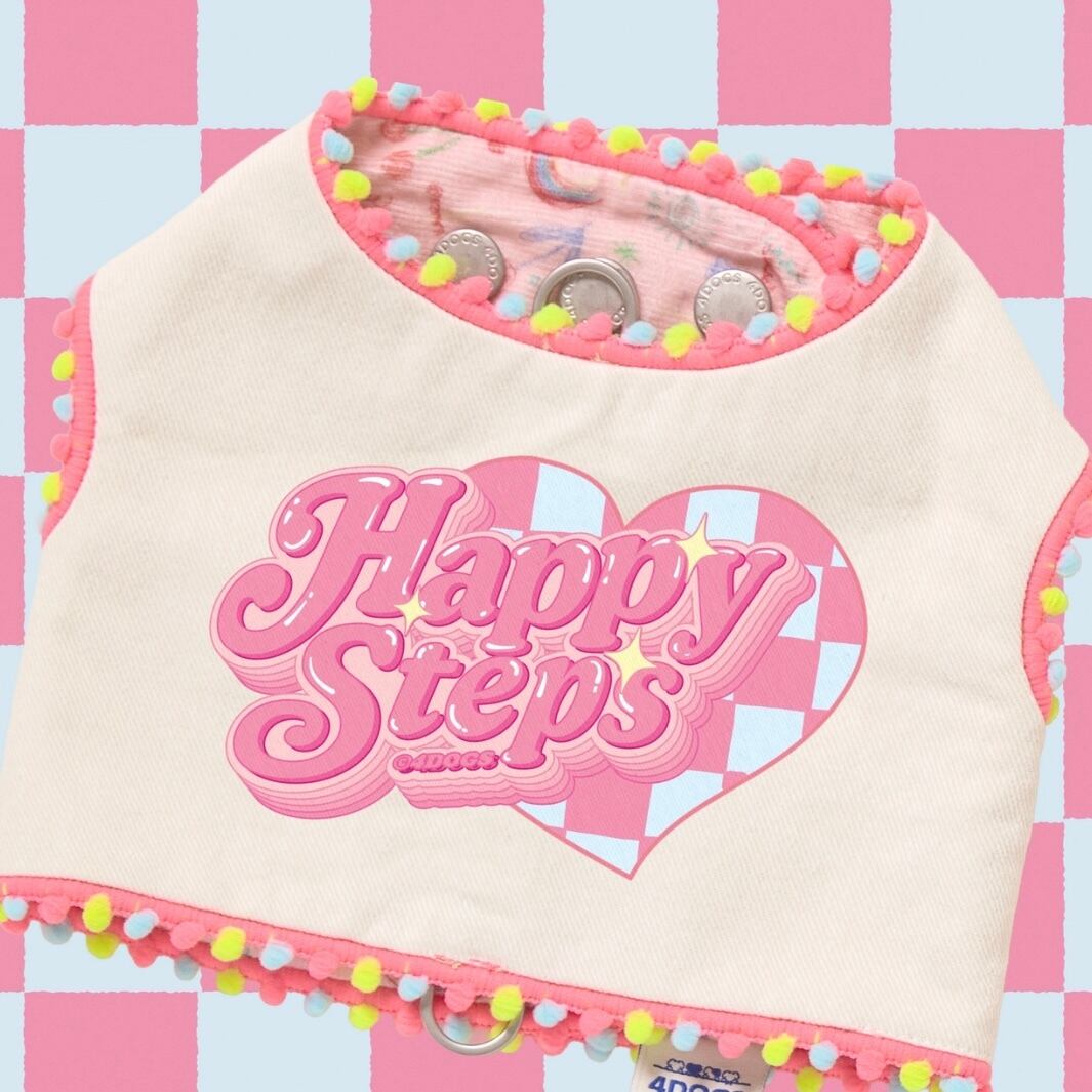 ・表地:10番手ツイルコットンデニムを使用。型崩れしにくく、柔らかなバニラカラーに「Happy Steps」グラフィック入り。
