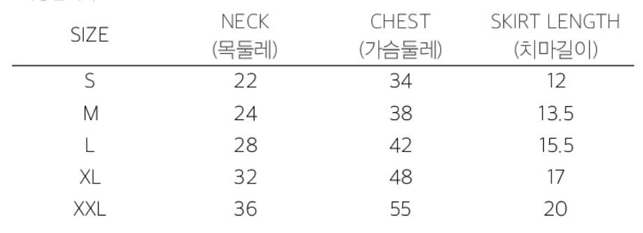2XL: 首回り 36cm / 胸囲 55cm / スカート丈 20cm