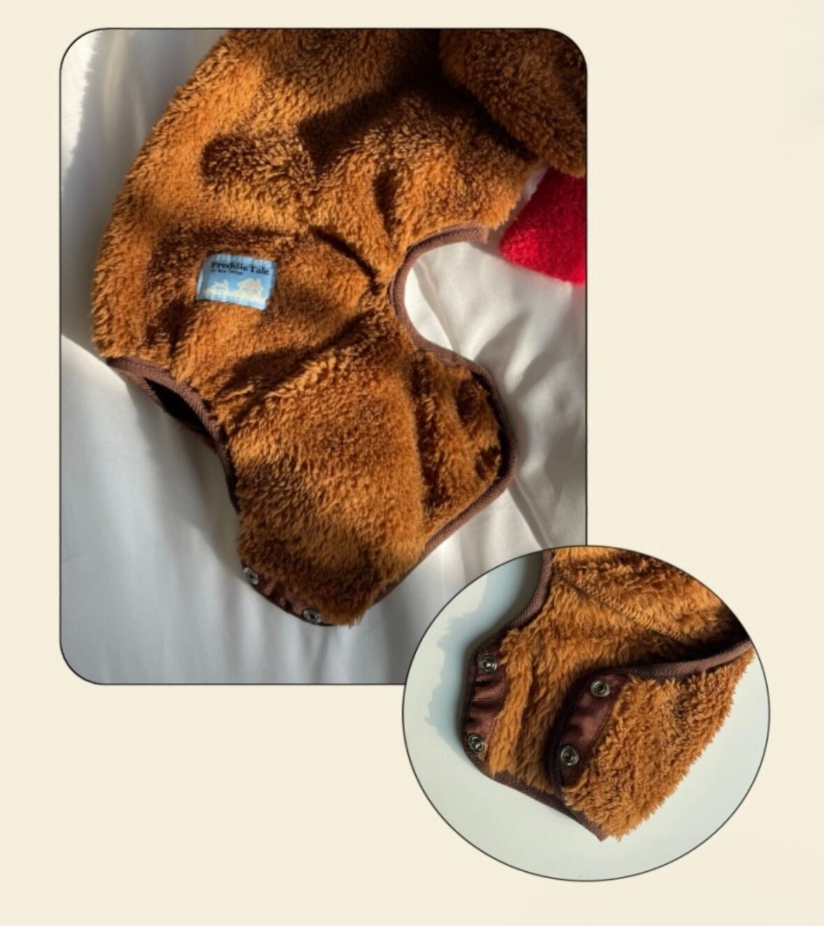 柔らかく伸縮性のあるフリース素材を全身に使用し、体をやさしく包み込むように保温。