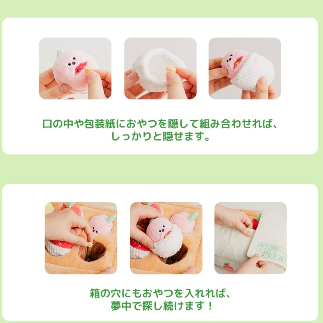 本体はフタ付きのボックス型で、ポケットはなんと18個。おやつを隠して探させることで、夢中になってノーズワーク遊びが楽しめます。