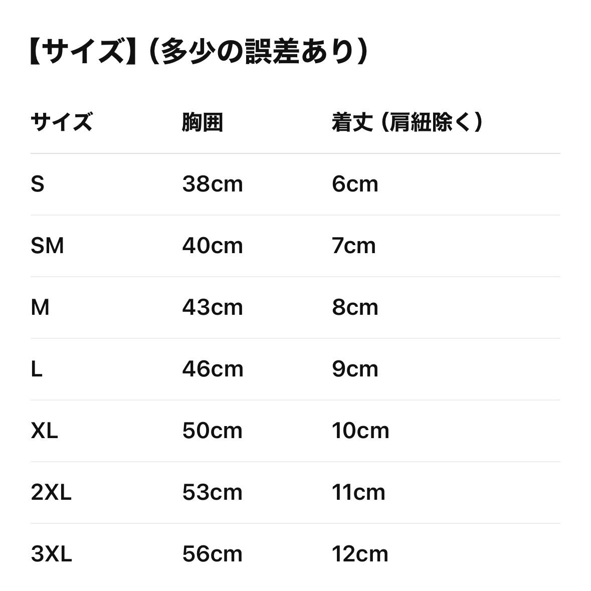 (例:胸囲40cmの子は、SMよりもMサイズがおすすめ)