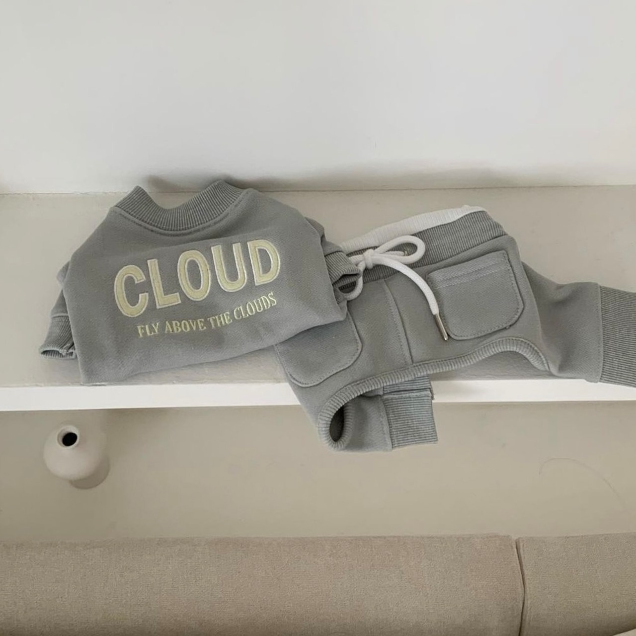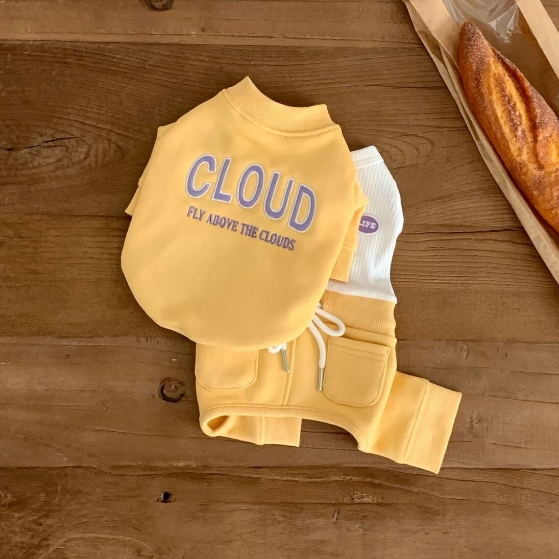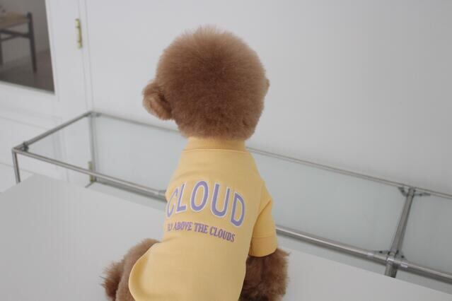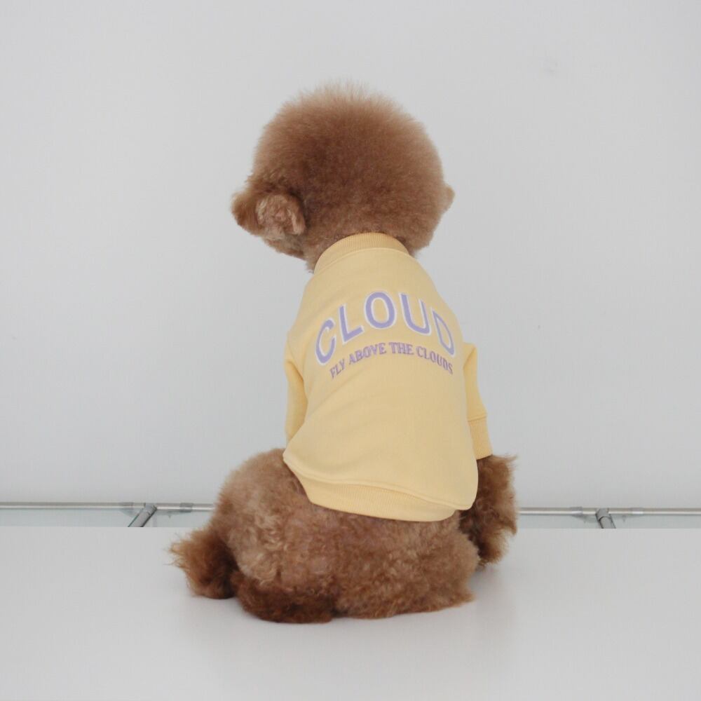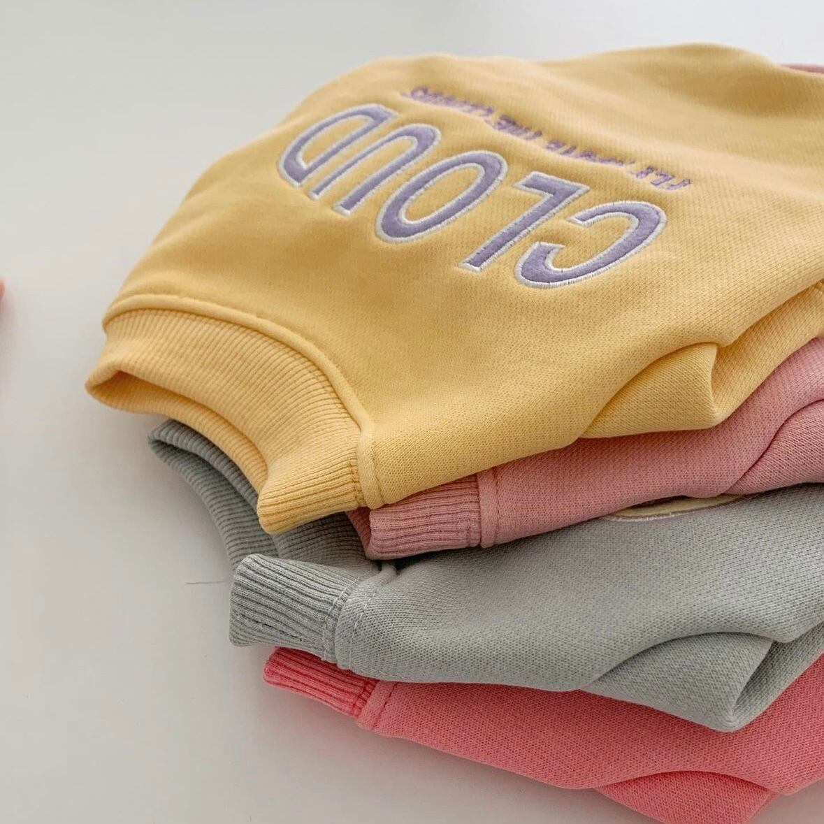 可愛らしい配色の「CLOUD」フェルト刺繍と、雲の上をふわふわと飛んでいる「Fly above the clouds」という文句が一緒になっています。