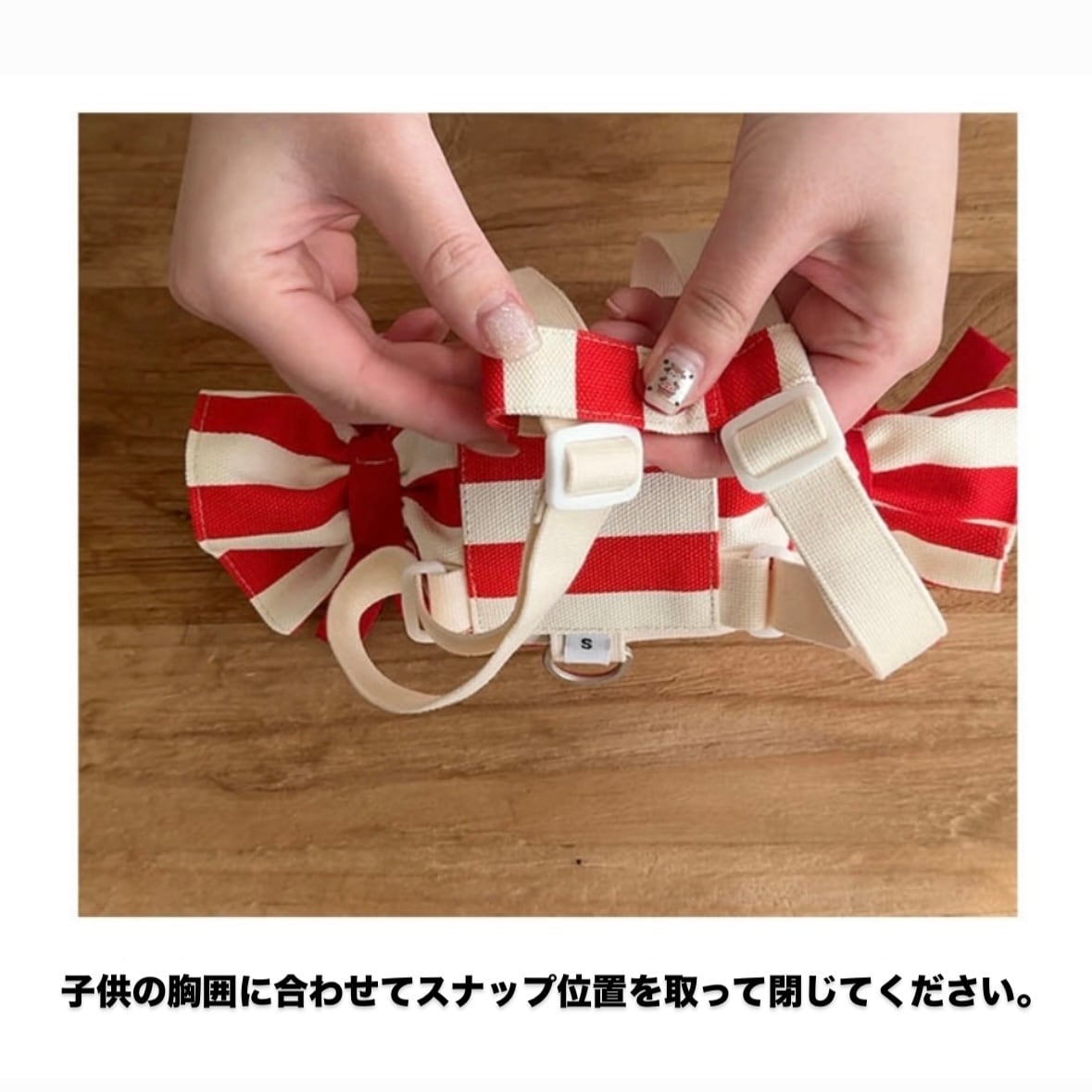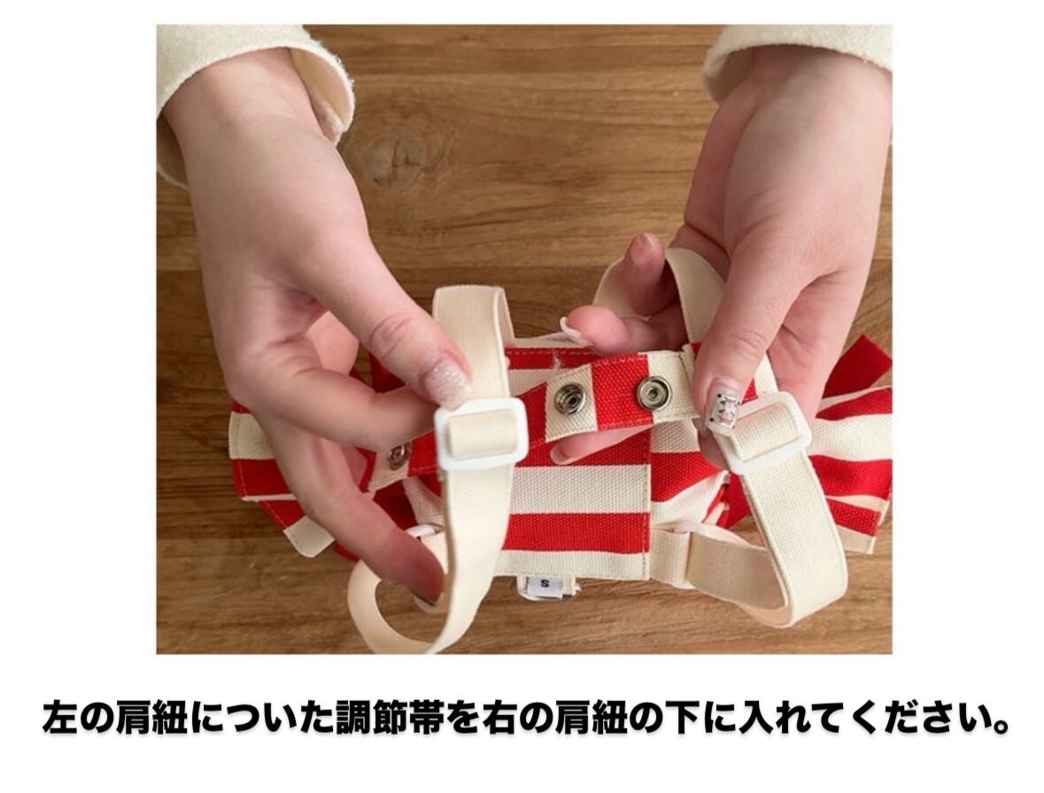 ・着用時は、まず調節紐を締めてから肩紐を調整すると、体にぴったりフィットします。